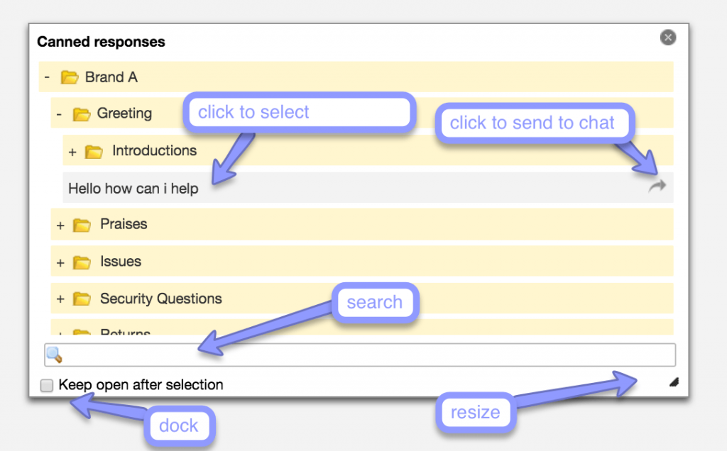 - Canned responses dialog now offers ability to be resized and docked within the operator panel, more intuitive display and search of canned responses and ability to send canned response directly to chat with a click of a mouse