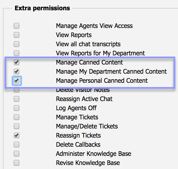 - Canned responses may be managed by all administrators as well as operators with “managed canned content” permission. Agents may also maintain personal canned response folders, this ability however may be disabled in operator permissions