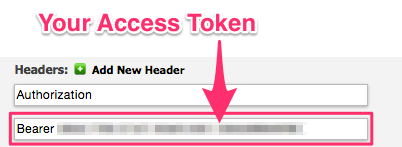 - In the “Headers” fields, enter “Authorization” for the key and enter “Bearer XXX” in the value field. Replace XXX with the Access Token you obtained in Step #1.