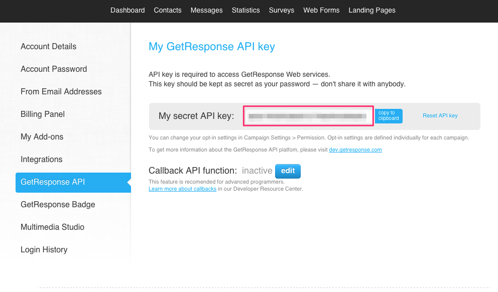 - Select the “GetResponse API” option from the menu on the left and copy the API Key from this page.