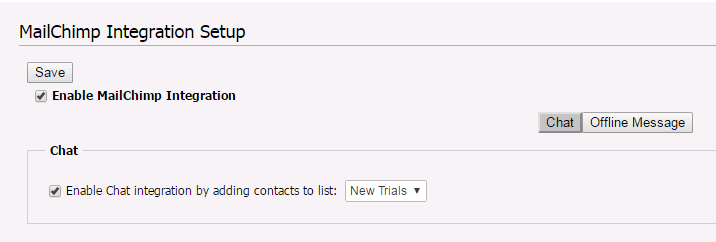 - The MailChimp Integration customization screen will show. Simpy select “Enable MailChimp Integration”, select the list to push contacts to upon chat session commencing or offline message being submitted and you are all set!