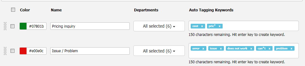 Setting up auto tag is easy! For each tag there is a space labeled “Auto Tagging Keywords” in which you may type in the keywords that will trigger an auto tag. For example, if the customer types in “cost” or “price”, the chat or email will be automatically tagged as a Pricing Inquiry:
