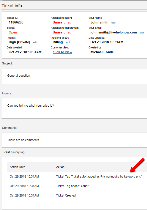 And here is an example of a ticket that is auto tagged: