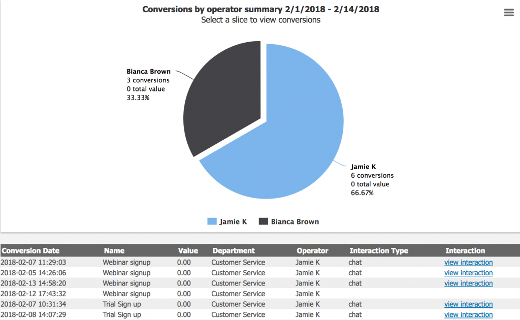 Totals per conversion, conversions by day and conversions by agents are reported on. You may also select individual conversions or agents to see a detailed view for each. Finally, selecting multiple conversions on the report will show customers who converted for all of the selected conversions!