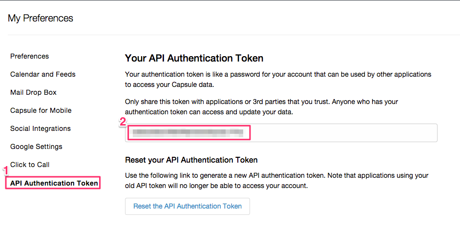 2. With the “API Authentication Token” option selected (1), copy the API Token from this screen (2).