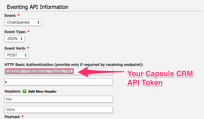4. In the HTTP Basic Authentication User name field, enter the API Token you copied from your Capsule CRM account in Step #2. In the password field, type “x” in the space provided. No values are required in the Headers fields.