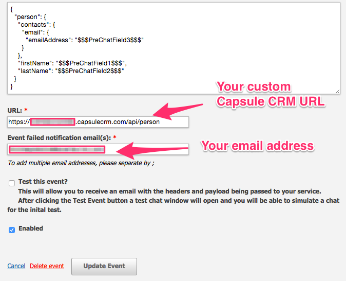 The $$$Email$$$ label in the Payload syntax above assumes you are collecting the chat user’s email address in the Pre-Chat Requested Information in LiveHelpNow mapped to “Email” CRM Field.