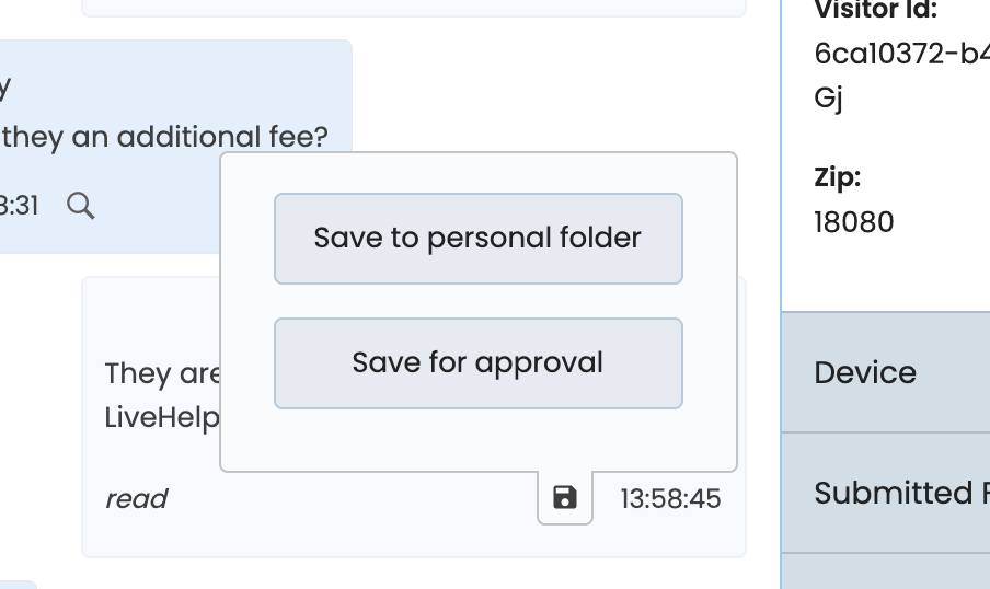 In the past, account admins and operators created and added canned responses to a database. Our new “Save to Canned Response” feature allows agents to save current text they used in a conversation directly into the canned response database. They can save the response into a personal folder or submit it for approval. Once an admin approves the canned response, it is added to the main canned responses database for all operators to use. This way, operators can reuse the text they type for one customer for future reference in similar situations.