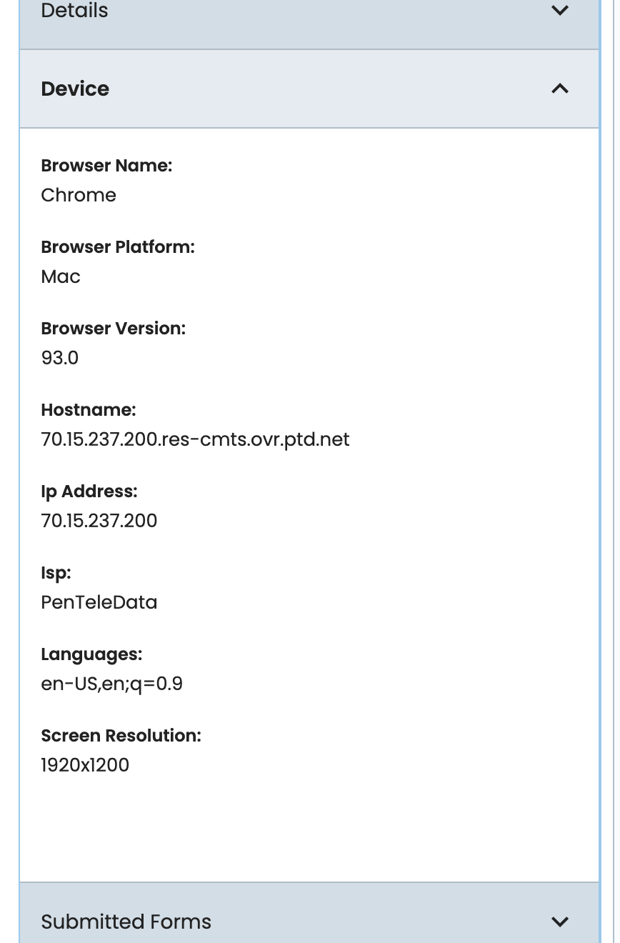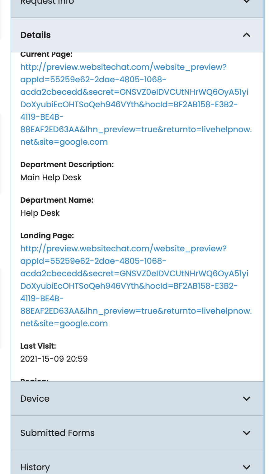 The middle columns can display further details about each visitor and customer chatting. Agents can see the pages customers landed on and explored, the device they are using, the forms they have submitted, and the history of all of the customers’ interactions.