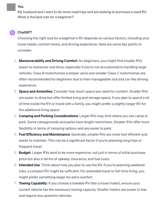 Take the niche process of buying used RVs, for example. AI can provide potential customers with specifications, compare models, and suggest the best features.